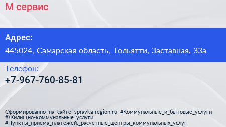 М-сервис по адресу 445024, Самарская область, Тольятти, Заставная, 33а в дальнейшем Организация, размещена в следующих категориях:
