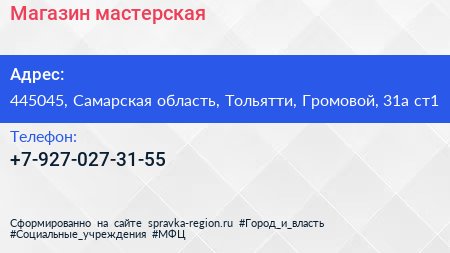 Магазин-мастерская по адресу 445045, Самарская область, Тольятти, Громовой, 31а ст1 в дальнейшем Организация, размещена в следующих категориях: