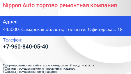 Nippon-Auto, торгово-ремонтная компания по адресу 445000, Самарская область, Тольятти, Офицерская, 18 в дальнейшем Организация, размещена в следующих категориях: