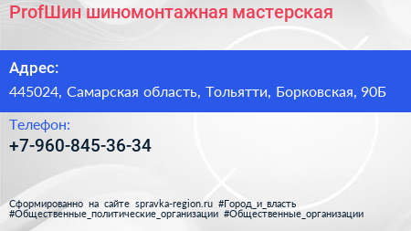 ProfШин, шиномонтажная мастерская по адресу 445024, Самарская область, Тольятти, Борковская, 90Б в дальнейшем Организация, размещена в следующих категориях: