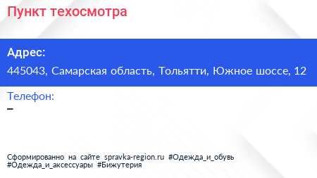 Пункт техосмотра по адресу 445043, Самарская область, Тольятти, Южное шоссе, 12 в дальнейшем Организация, размещена в следующих категориях: