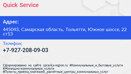 Quick Service по адресу 445043, Самарская область, Тольятти, Южное шоссе, 22 ст13 в дальнейшем Организация, размещена в следующих категориях: