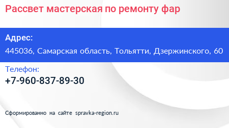 Рассвет, мастерская по ремонту фар по адресу 445036, Самарская область, Тольятти, Дзержинского, 60 в дальнейшем Организация, размещена в следующих категориях: