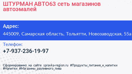 ШТУРМАН-АВТО63, сеть магазинов автоэмалей по адресу 445009, Самарская область, Тольятти, Новозаводская, 55а в дальнейшем Организация, размещена в следующих категориях: