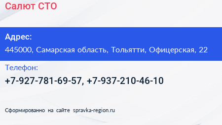 Салют, СТО по адресу 445000, Самарская область, Тольятти, Офицерская, 22 в дальнейшем Организация, размещена в следующих категориях: