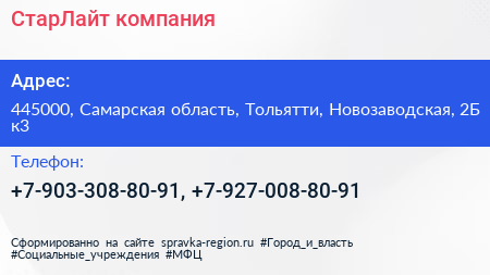 СтарЛайт, компания по адресу 445000, Самарская область, Тольятти, Новозаводская, 2Б к3 в дальнейшем Организация, размещена в следующих категориях: