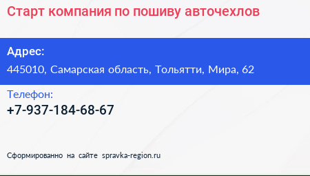 Старт, компания по пошиву авточехлов по адресу 445010, Самарская область, Тольятти, Мира, 62 в дальнейшем Организация, размещена в следующих категориях: