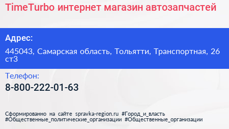 TimeTurbo, интернет-магазин автозапчастей по адресу 445043, Самарская область, Тольятти, Транспортная, 26 ст3 в дальнейшем Организация, размещена в следующих категориях: