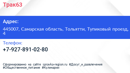 Трак63 по адресу 445007, Самарская область, Тольятти, Тупиковый проезд, 4 в дальнейшем Организация, размещена в следующих категориях: