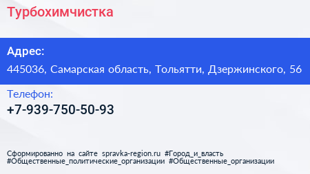 Турбохимчистка по адресу 445036, Самарская область, Тольятти, Дзержинского, 56 в дальнейшем Организация, размещена в следующих категориях: