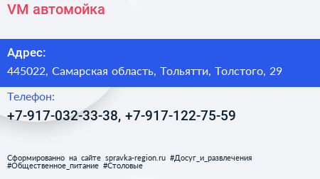 VM, автомойка по адресу 445022, Самарская область, Тольятти, Толстого, 29 в дальнейшем Организация, размещена в следующих категориях: