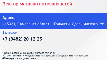 Вектор, магазин автозапчастей по адресу 445024, Самарская область, Тольятти, Дзержинского, 98 в дальнейшем Организация, размещена в следующих категориях: