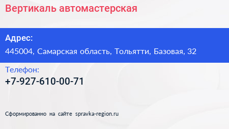 Вертикаль, автомастерская по адресу 445004, Самарская область, Тольятти, Базовая, 32 в дальнейшем Организация, размещена в следующих категориях: