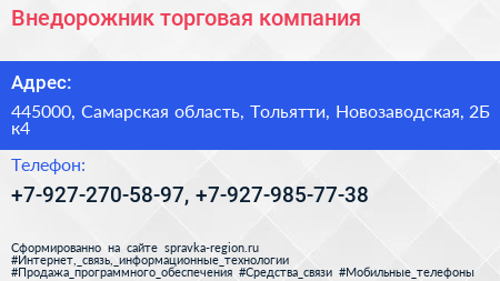 Внедорожник, торговая компания по адресу 445000, Самарская область, Тольятти, Новозаводская, 2Б к4 в дальнейшем Организация, размещена в следующих категориях: