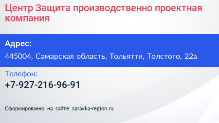 Центр Защита, производственно-проектная компания по адресу 445004, Самарская область, Тольятти, Толстого, 22а в дальнейшем Организация, размещена в следующих категориях: