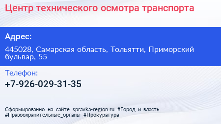 Центр технического осмотра транспорта по адресу 445028, Самарская область, Тольятти, Приморский бульвар, 55 в дальнейшем Организация, размещена в следующих категориях: