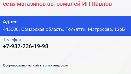сеть магазинов автоэмалей, ИП Павлов по адресу 445008, Самарская область, Тольятти, Матросова, 126Б в дальнейшем Организация, размещена в следующих категориях: