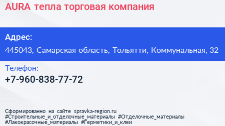 AURA тепла, торговая компания по адресу 445043, Самарская область, Тольятти, Коммунальная, 32 в дальнейшем Организация, размещена в следующих категориях: