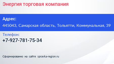 Энергия, торговая компания по адресу 445043, Самарская область, Тольятти, Коммунальная, 39 в дальнейшем Организация, размещена в следующих категориях: