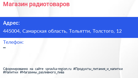 Магазин радиотоваров по адресу 445004, Самарская область, Тольятти, Толстого, 12 в дальнейшем Организация, размещена в следующих категориях: