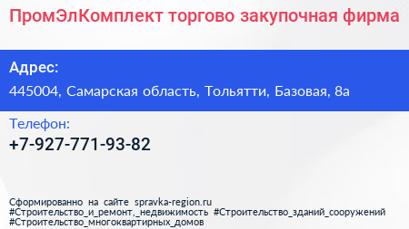 ПромЭлКомплект, торгово-закупочная фирма по адресу 445004, Самарская область, Тольятти, Базовая, 8а в дальнейшем Организация, размещена в следующих категориях: