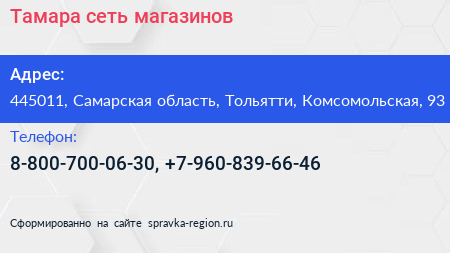 Тамара, сеть магазинов по адресу 445011, Самарская область, Тольятти, Комсомольская, 93 в дальнейшем Организация, размещена в следующих категориях: