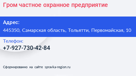 Гром, частное охранное предприятие по адресу 445350, Самарская область, Тольятти, Первомайская, 10 в дальнейшем Организация, размещена в следующих категориях: