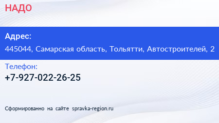 НАДО по адресу 445044, Самарская область, Тольятти, Автостроителей, 2 в дальнейшем Организация, размещена в следующих категориях: