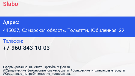 Slabo по адресу 445037, Самарская область, Тольятти, Юбилейная, 29 в дальнейшем Организация, размещена в следующих категориях: