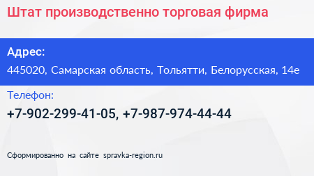 Штат, производственно-торговая фирма по адресу 445020, Самарская область, Тольятти, Белорусская, 14е в дальнейшем Организация, размещена в следующих категориях: