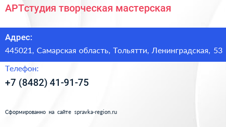 АРТстудия, творческая мастерская по адресу 445021, Самарская область, Тольятти, Ленинградская, 53 в дальнейшем Организация, размещена в следующих категориях: