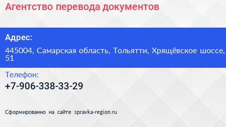 Агентство перевода документов по адресу 445004, Самарская область, Тольятти, Хрящёвское шоссе, 51 в дальнейшем Организация, размещена в следующих категориях: