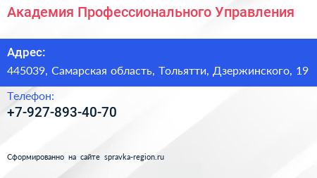Академия Профессионального Управления по адресу 445039, Самарская область, Тольятти, Дзержинского, 19 в дальнейшем Организация, размещена в следующих категориях: