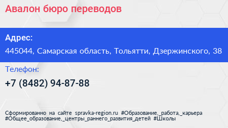 Авалон, бюро переводов по адресу 445044, Самарская область, Тольятти, Дзержинского, 38 в дальнейшем Организация, размещена в следующих категориях: