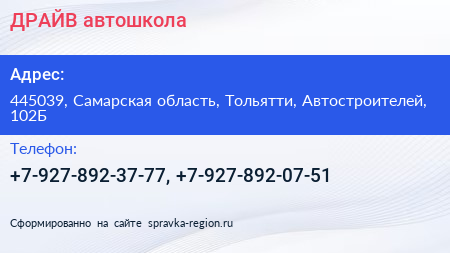 ДРАЙВ, автошкола по адресу 445039, Самарская область, Тольятти, Автостроителей, 102Б в дальнейшем Организация, размещена в следующих категориях: