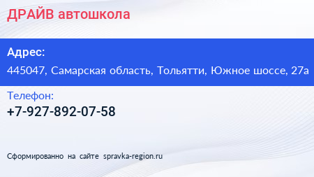 ДРАЙВ, автошкола по адресу 445047, Самарская область, Тольятти, Южное шоссе, 27а в дальнейшем Организация, размещена в следующих категориях: