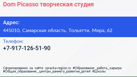 Dom Picasso, творческая студия по адресу 445010, Самарская область, Тольятти, Мира, 62 в дальнейшем Организация, размещена в следующих категориях: