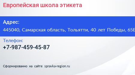 Европейская школа этикета по адресу 445040, Самарская область, Тольятти, 40 лет Победы, 65Б в дальнейшем Организация, размещена в следующих категориях: