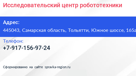Исследовательский центр робототехники по адресу 445043, Самарская область, Тольятти, Южное шоссе, 165а в дальнейшем Организация, размещена в следующих категориях: