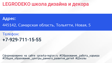 LEGRODEKO, школа дизайна и декора по адресу 445142, Самарская область, Тольятти, Новая, 5 в дальнейшем Организация, размещена в следующих категориях: