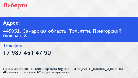 Либерти по адресу 445051, Самарская область, Тольятти, Приморский бульвар, 8 в дальнейшем Организация, размещена в следующих категориях: