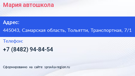 Мария, автошкола по адресу 445043, Самарская область, Тольятти, Транспортная, 7/1 в дальнейшем Организация, размещена в следующих категориях: