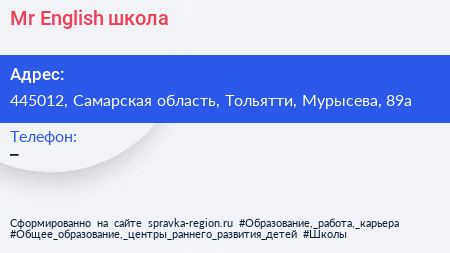 Mr English, школа по адресу 445012, Самарская область, Тольятти, Мурысева, 89а в дальнейшем Организация, размещена в следующих категориях: