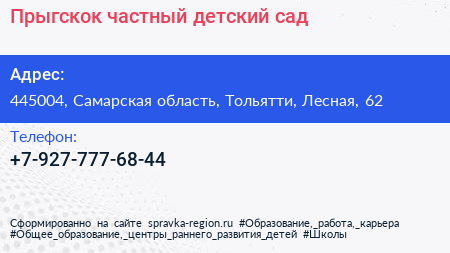 Прыгскок, частный детский сад по адресу 445004, Самарская область, Тольятти, Лесная, 62 в дальнейшем Организация, размещена в следующих категориях: