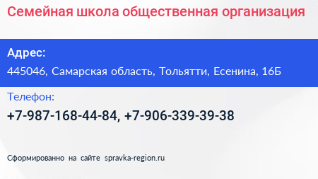 Семейная школа, общественная организация по адресу 445046, Самарская область, Тольятти, Есенина, 16Б в дальнейшем Организация, размещена в следующих категориях: