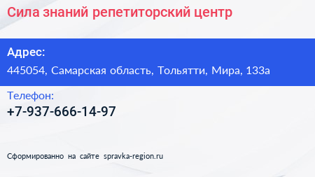 Сила знаний, репетиторский центр по адресу 445054, Самарская область, Тольятти, Мира, 133а в дальнейшем Организация, размещена в следующих категориях: