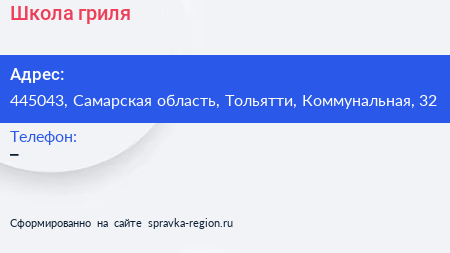 Школа гриля по адресу 445043, Самарская область, Тольятти, Коммунальная, 32 в дальнейшем Организация, размещена в следующих категориях: