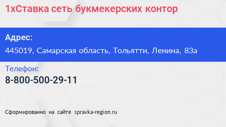 1xСтавка, сеть букмекерских контор по адресу 445019, Самарская область, Тольятти, Ленина, 83а в дальнейшем Организация, размещена в следующих категориях: