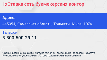 1xСтавка, сеть букмекерских контор по адресу 445054, Самарская область, Тольятти, Мира, 107а в дальнейшем Организация, размещена в следующих категориях: