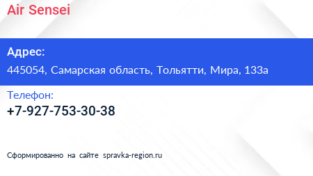 Air Sensei по адресу 445054, Самарская область, Тольятти, Мира, 133а в дальнейшем Организация, размещена в следующих категориях: